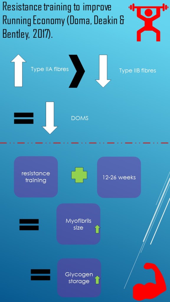 Resistance training is well known to help improve performance for an ultra-marathon runner. This is due to an increase in Type IIA fibres and a decrease in type IIB fibres which allows muscles to be more powerful which improves running economy (Doma, Deakin & Bentley, 2017). This type of action involves stretching the sarcomere which then strains the myofilaments causing delay onset muscles soreness (DOMS) (Aaron Bubbico & Len Kravitz, 2010). It can therefore be proposed that athletes use the repeated bout effect approach to resistance training as this is well known to reduces DOMS by stimulating the muscles repetitively. Also, for beginners wanting to participate in a race it would be appropriate for them to carry out resistance training as research has shown that it increases muscle glycogen storage due to the improvements of myofibrils size between 12-26 weeks and that it is beneficial for neuromuscular system up to the first eight weeks (Bird, Tarpenning & Marino, 2005). It is important to note that a training partner is necessary during this type of training to help reduce risk of injury.